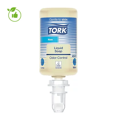 Le savon liquide mains anti-odeurs de la marque Tork est idéal pour le personnel de cuisine.