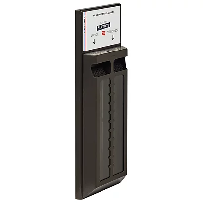 Acier traité anticorrosion et poudré anti UV Cendrier gradué 2 X 3L Séparateur entre les 2 cendriers Façade en verre trempé 4 mm Décrochage facile par cliquet discret Plaque écrase mégôts en inox Emplacement sticker de sondage (format A5)