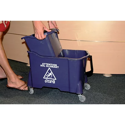 Chariot muni de : 2 seaux dont 1 amovible, une presse latérale pour l’essorage. Maniable grâce à ses roues caoutchouc et son manche de presse surélevé. Capacité 12 + 10 litres.
