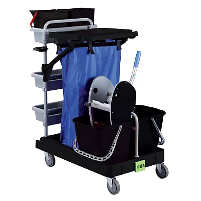 Base polypropylène recyclé noir, 4 roues Ø 100 mm. Montants tube métal : traitement anticorrosion Rilsan. Fourni avec 3 plateaux L. 47 x l. 14 x H. 10 cm. 2 seaux de surface de 6 L et 2 seaux de sols 15 L. Porte-manche et repose-balai. Porte-sac poubelle 110 L. Dim. : L. 52 x l. 116 x H. 100 cm. Poids 19 kg. Double support sac pour tri sélectif. Livré pré-monté, montage rapide sans outil.