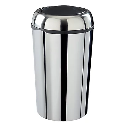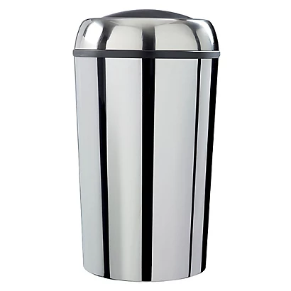 Corps et tête en inox. Couvercle basculant en plastique noir avec contrepoids stabilisateur. Seau intérieur en plastique polypropylène noir avec anse en acier chromé.