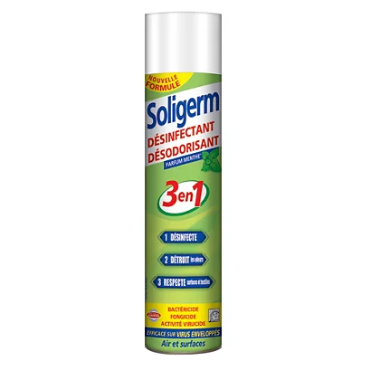 Le désinfectant désodorisant de la marque Soligerm est idéal pour une utilisation en entreprise et à la maison. Ce produit 3en1 désinfecte, détruit les mauvaises odeurs et désodorise l’air et les surface de vos intérieurs.