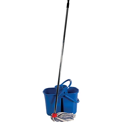 2 bacs : l’un pour l’eau propre et détergent, l’autre pour l’eau usée. Livré complet. Seau contenance 2 x 7 L. Ensemble avec essoreur incorporé et balai complet.