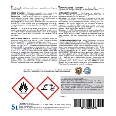 Il est proposé en bidon de 5 L, et est de fabrication française. Il est utilisable aussi bien manuellement qu’en autolaveuse.