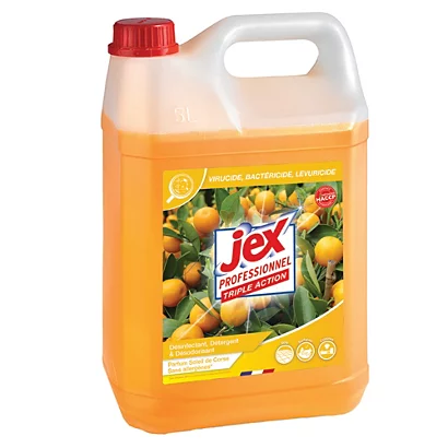Le nettoyant multi-usages désinfectant Jex est proposé en bidon de 5 L. Il est utilisable aussi bien manuellement qu’en autolaveuse.
