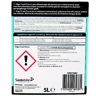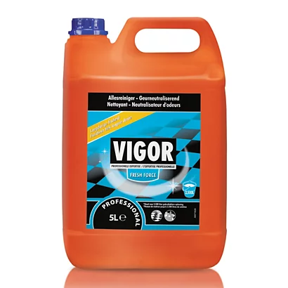 Le nettoyant multi-usages Vigor Fresh Force est un nettoyant parfumé pour toutes les surfaces résistantes à l’eau. Ce nettoyant multi-usages produit un effet désodorisant de longue durée grâce à la technologie O.N.T. Il nettoie ainsi vos surfaces tout en enlevant les mauvaises odeurs.