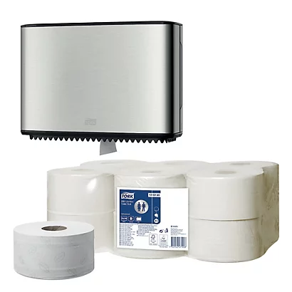Le kit est composé d’un distributeur de papier toilette bobine Jumbo Tork Mini et d’un colis de 12 mini bobines.