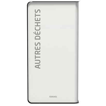 Acier poudré anti-UVCouvercle à ouverture calibrée pour le tri Porte à ouverture frontale ”push” sérigraphiée Bac intérieur plastique roulant intégré 65L4 pieds réglables en plastique évitant le contact avec le solSolution pour le tri sélectifInstallation préconisée dans un espace couvert
