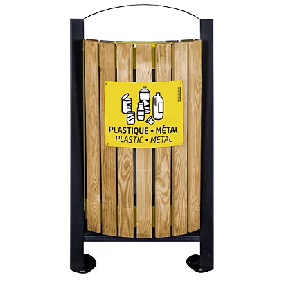 Acier traité anticorrosion Acier poudré anti-UVFaçade avec lattes traitées “autoclave“ : bois certifié “Classe 4“ (sans entretien) Ouverture par basculement de la façade vers l’avantLivré avec 2 plaques de tri vissées avec stickers pour fixation sur la façade