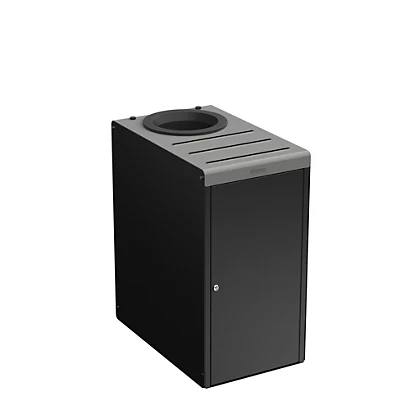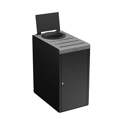 Acier poudré anti-UV traité anticorrosion Dépose plateau en inox et serrure à clé triangulaireSystème d’ouverture push/pull mécanique Joint vide ordure amoviblePieds en plastique réglablesBac intérieur roulant en plastique 65L fourni Extraction des bacs par l’avant ou par l’arrière