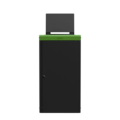 Acier poudré anti-UV traité anticorrosion Dépose plateau en inox et serrure à clé triangulaireSystème d’ouverture push/pull mécanique Joint vide ordure amoviblePieds en plastique réglablesBac intérieur roulant en plastique 65L fourni Extraction des bacs par l’avant ou par l’arrière