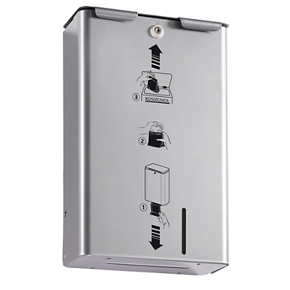 Acier poudré anti-UVKit étiers intégré pour maintien du sac Compartiment pour les sachets amovible Serrure à clé. Ouverture frontale et blocage du capot en position ouverte : facilite le réapprovisionnement. Sérigraphie sur le corps Consommable : sachets périodiques FEMINA (Réf: 99099)