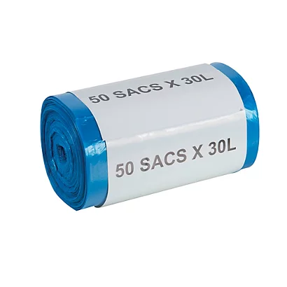 Carton de 500 sacs bleus 30 L.10 rouleaux par carton. Épaisseur 11 microns, hauteur 65 cm, Ø 26 cm, soufflet 2 x 12 cm